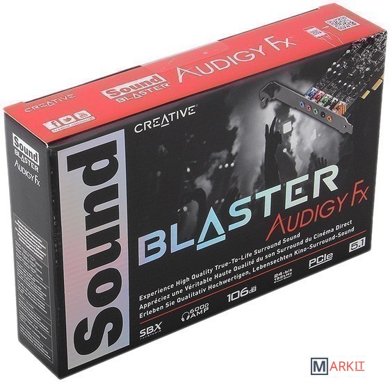 Sound Blaster Audigi Fx (SB1570) оснащена технологией SBX Pro Studio и обеспечивает звучание в формате 5.1 для фильмов, музыки и игр. Поставляется с панелью управления Sound Blaster Audigy Fx, которая предоставляет возможность тонкой настройки SBX Pro Studio. Функция Stereo Direct позволяет прослушивать необработанную музыку с великолепным битрейтом 24 бит/192 кГц и соотношением сигнал/шум на уровне 106 дБ, а усилитель для наушников с сопротивлением 600 Ом позволяет прослушивать звук в качестве, сопоставимом со студийным оборудованием.